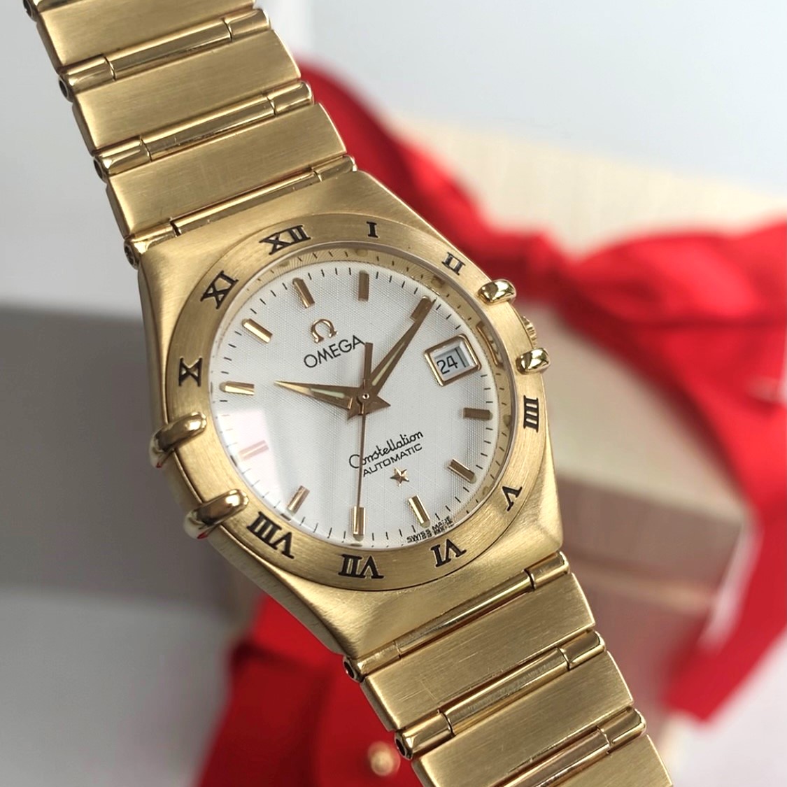 Case Material: 18K solid yellow gold case, with 18K solid yellow gold Omega signed crown and 18K solid yellow gold bezel