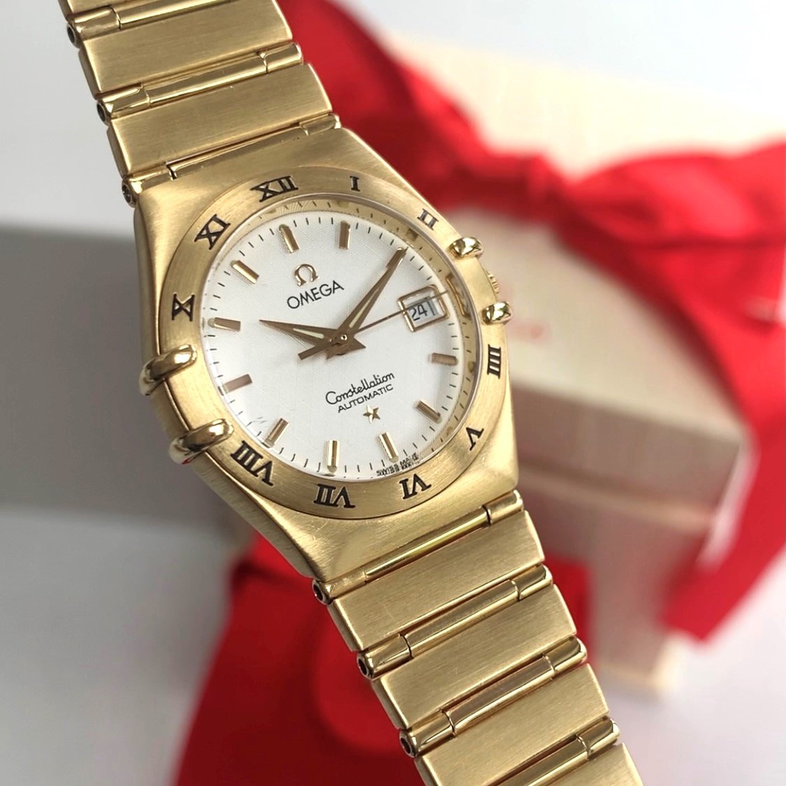 This luxurious gold ladies Omega watch is a timeless and rare piece from the 1995 International Collection. A classic feminine Omega watch, this 28mm Constellation is made with an 18K solid yellow gold case featuring a bezel engraved with timeless Roman numerals and a stunning cream dial. The hands, Omega logo, Constellation star and indexes are also in 18K gold.