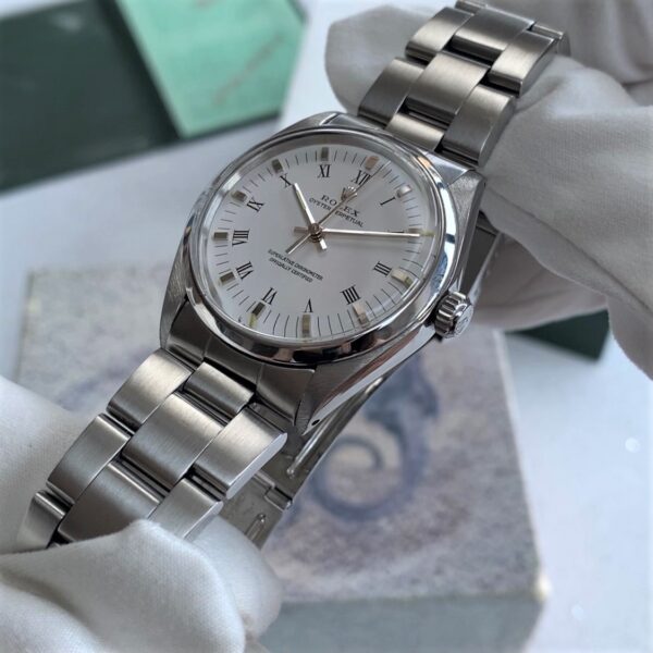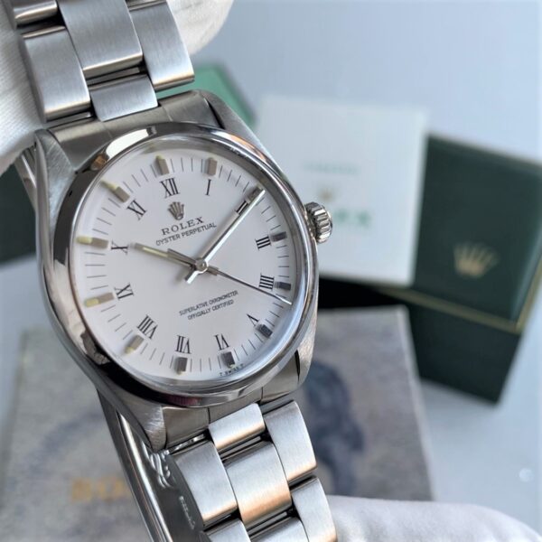 A rare opportunity to purchase a 1979 vintage Gents Rolex Oyster Perpetual Ref 1002 in exquisite condition. It has an immaculate crisp white dial with Roman numerals and smooth polished fixed bezel. Fully serviced by our in-house watchmaker it comes complete with its full original Oyster bracelet, and original vintage Rolex Oyster boxes and paperwork from its one owner.  The serial number dates the watch to 1979, however the watch was originally sold (and therefore the paperwork is dated) 1980. This really is a vintage Rolex collectors dream come true!