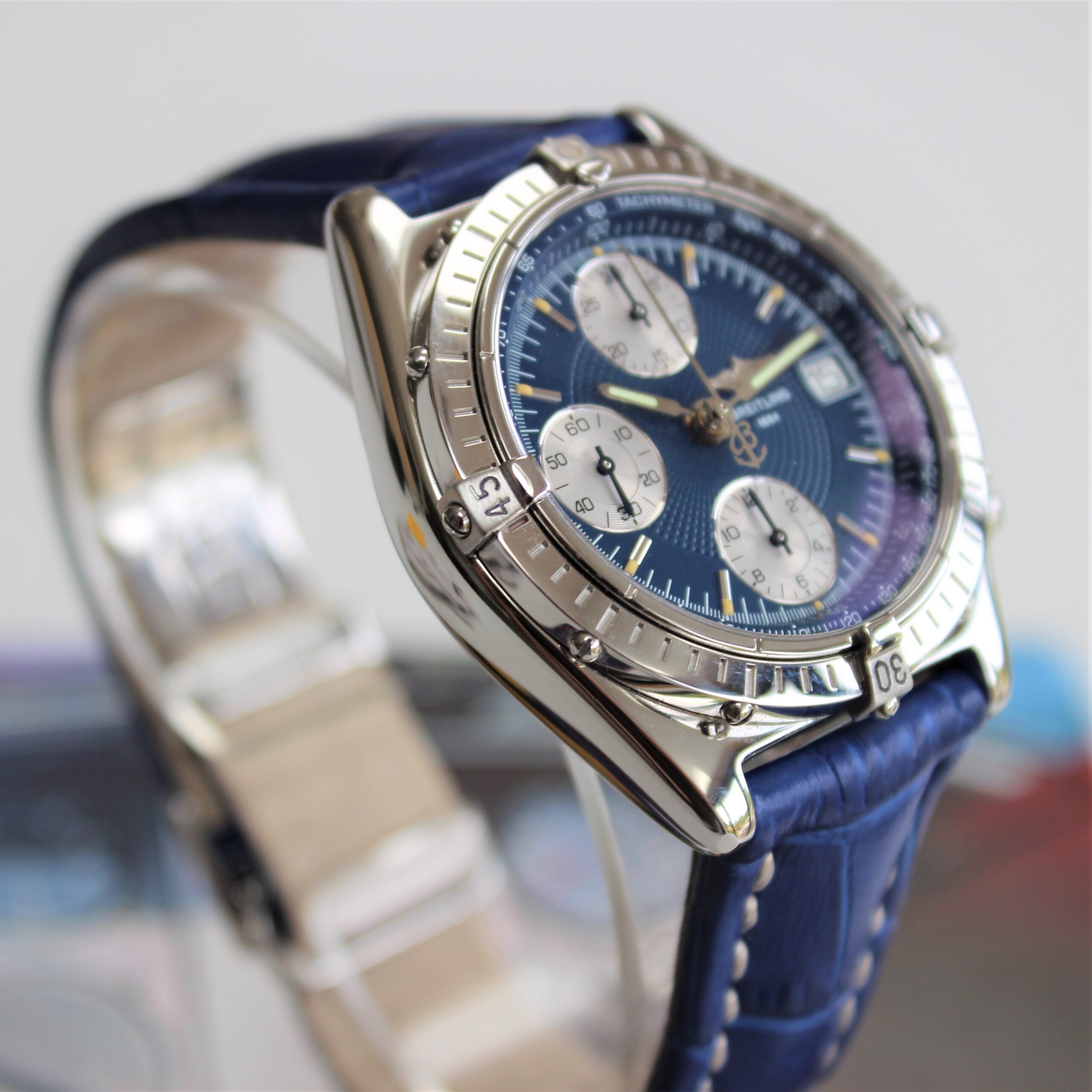 The ‘Chronomat’ was first presented by Breitling in 1984. A combination of ‘Chronograph’ and ‘Automatic’, and originally a designed as a pilots watch, the Chronomat has undergone various iterations and evolutions through the years which have been globally successful. The Chronomat’s signature rider tabs not only protect the glass but also mark every quarter hour. The rider tabs at 15 and 45 can be unscrewed and inverted, making it possible to use the bezel for countdown or count up. This 1997 blue dial Chronomat is in amazing condition. It looks striking on its light blue alligator style strap and with its full original box and paperwork, this is the perfect watch for every occasion.