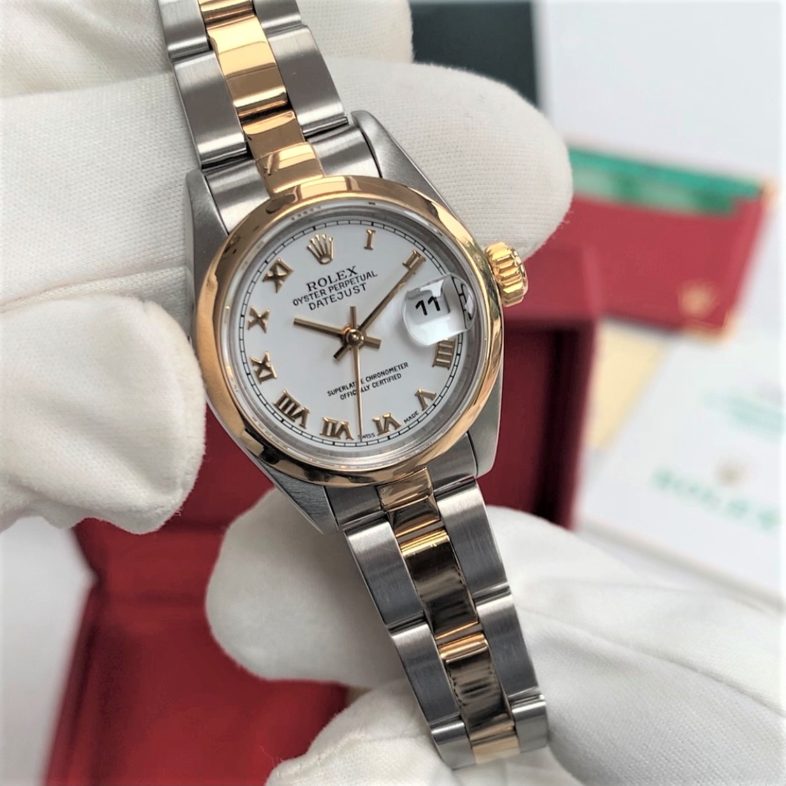 Dial colour: Classic white dial with gold hands, roman numerals, and date window at 3 o’clock