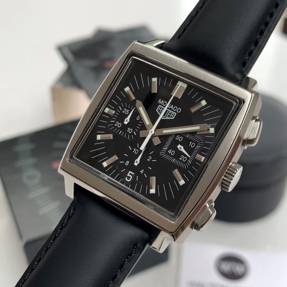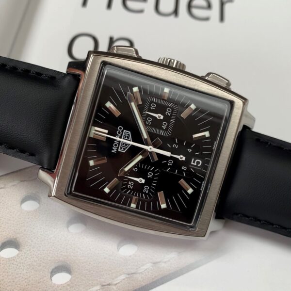 The famous and iconic Monaco is one of TAG Heuer’s most popular and desirable models. The Heuer Monaco CS2111 is one of only 2 series of Monaco re-editions to retain the Heuer only branding and is popular with collectors for this reason. This particular watch dates to 2002 and comes with its original box, booklets and guarantee card.  With its stunning jet black three sub-dial display, smart new black leather strap and immaculate stainless steel case this is a fantastic opportunity not to miss out on!