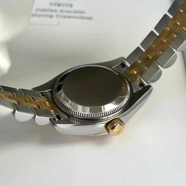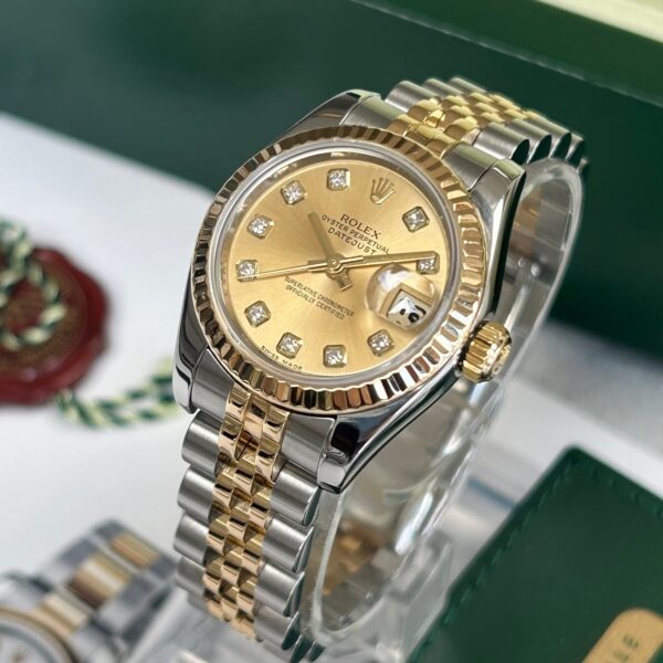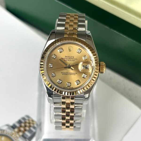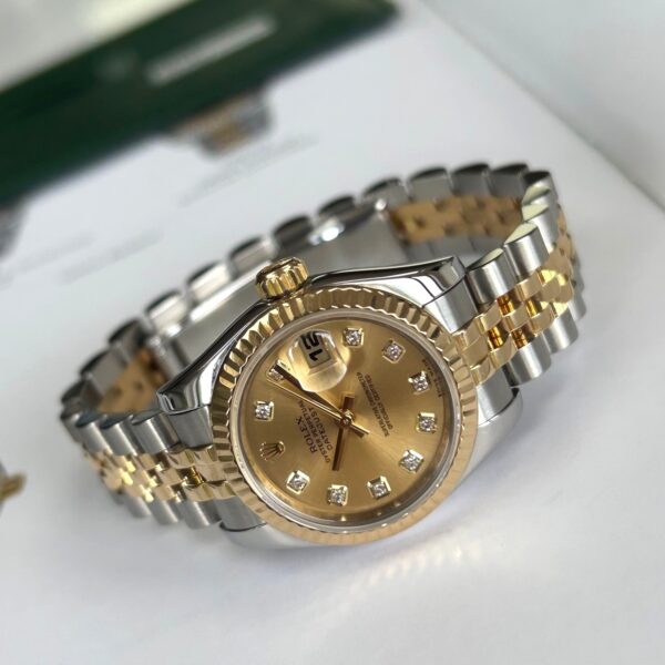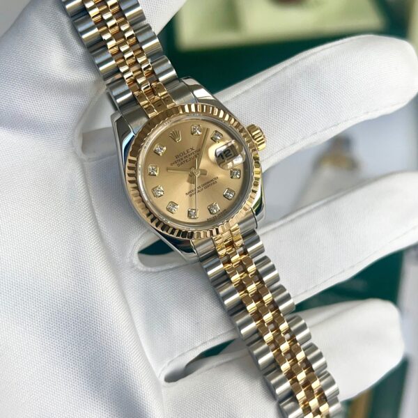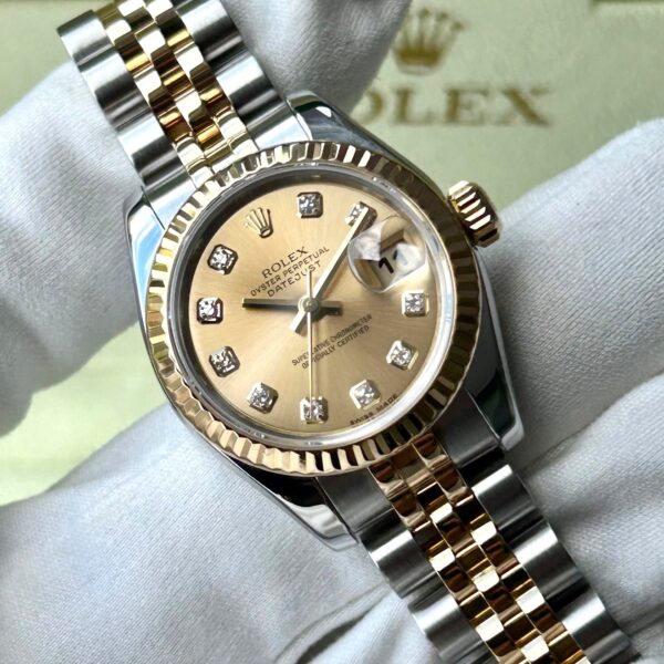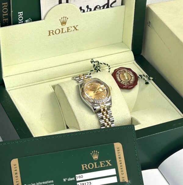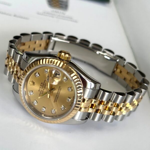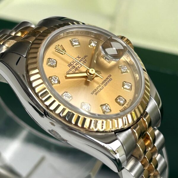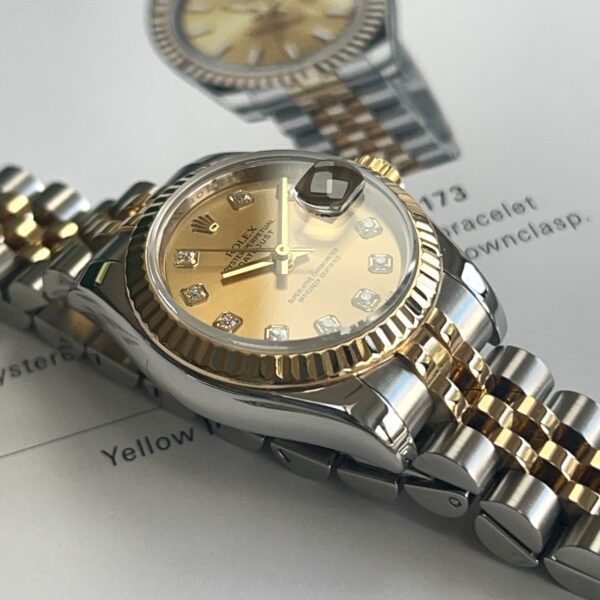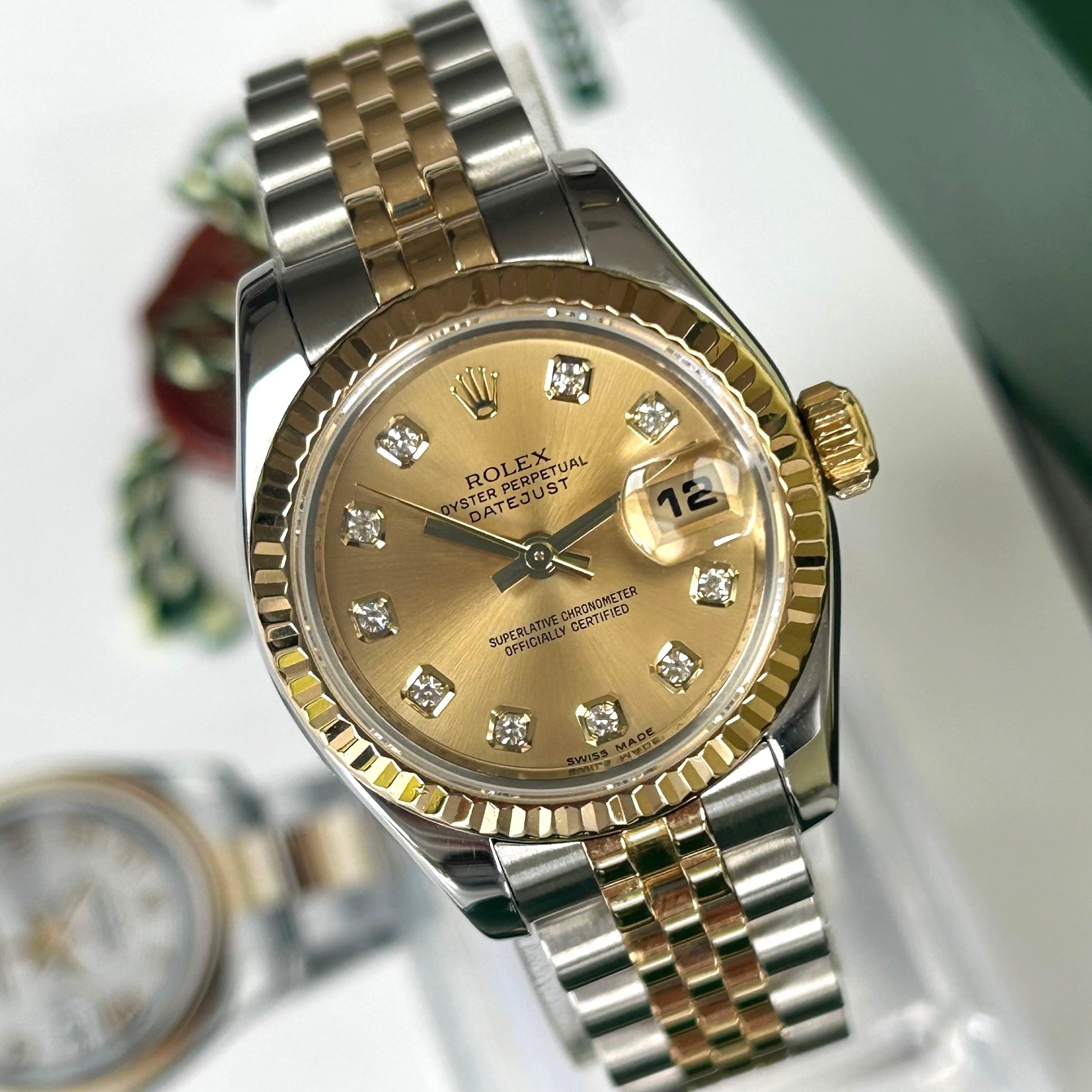 This Rolex Oyster Perpetual Lady Datejust in 18ct gold and stainless steel features a beautiful original champagne diamond-set dial, gold fluted bezel and original jubilee bracelet.