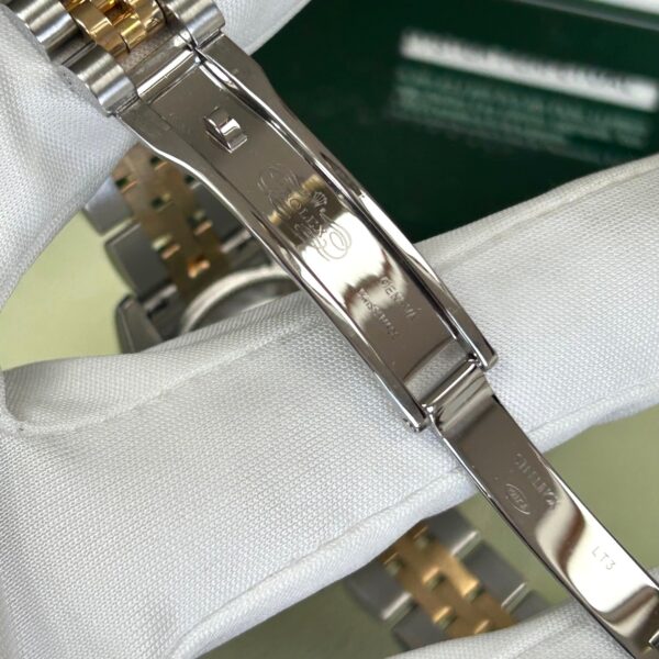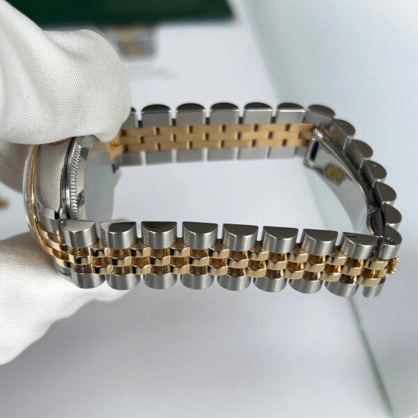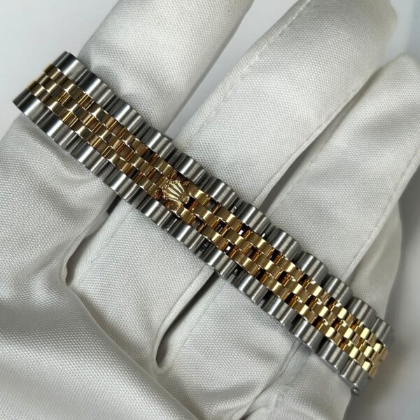 Strap: 18ct gold and stainless steel five-piece link Jubilee bracelet with concealed folding crown clasp.  Bracelet will fit a maximum wrist size of 17.5cm.