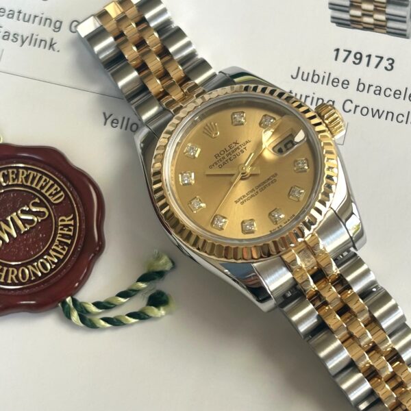 Be the first to review “2010 Rolex Lady Datejust 18ct Gold & Stainless Steel 26mm Automatic, Diamond Dial 179173”