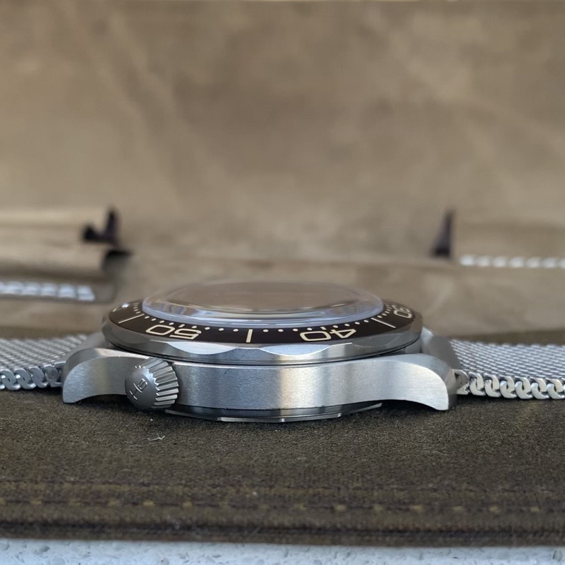 Case Material: Grade 2 Titanium case, screw down crown and helium escape valve. Brown aluminium uni-directional rotating bezel